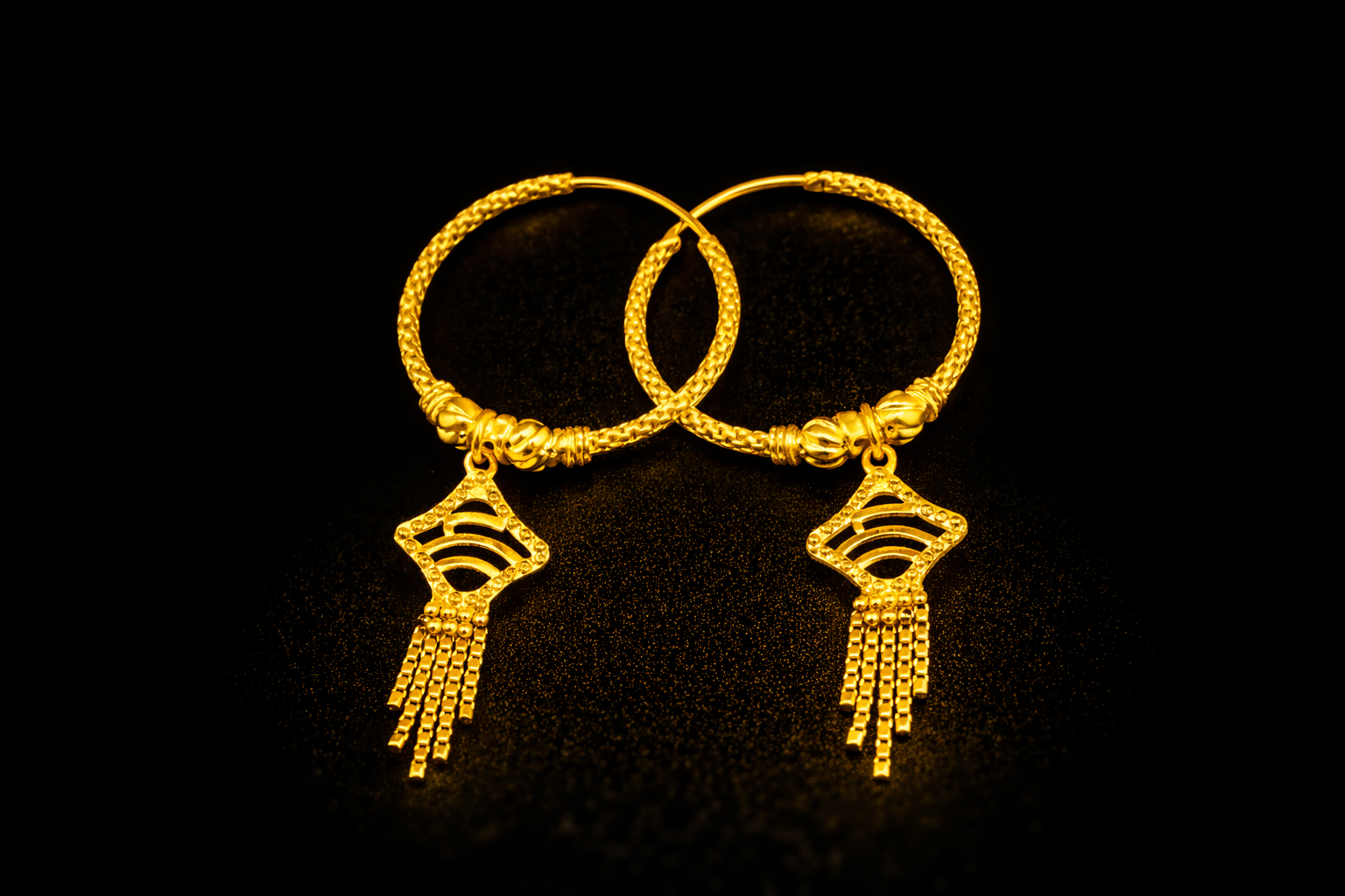These elegant gold bali earrings feature a textured hoop design that gives the jewellery a rich and detailed appearance. The hoop is decorated with small ornamental bead accents and finished with a geometric shaped drop charm. The charm is paired with delicate chain tassels that create graceful movement and add a stylish touch to the design. The bright polished gold finish highlights the intricate details, making these earrings perfect for both everyday wear and festive occasions.
