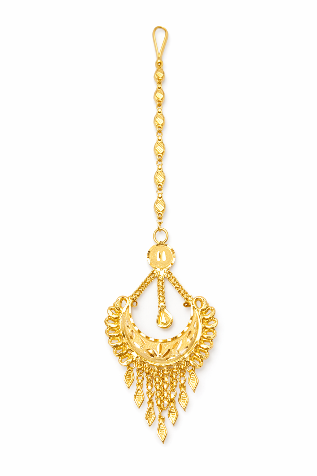 This elegant gold mang tika features a graceful crescent-shaped centerpiece with fine engraved detailing and delicate cutwork patterns. The upper circular element adds a balanced structure to the design, while three small chain drops enhance its traditional appeal.