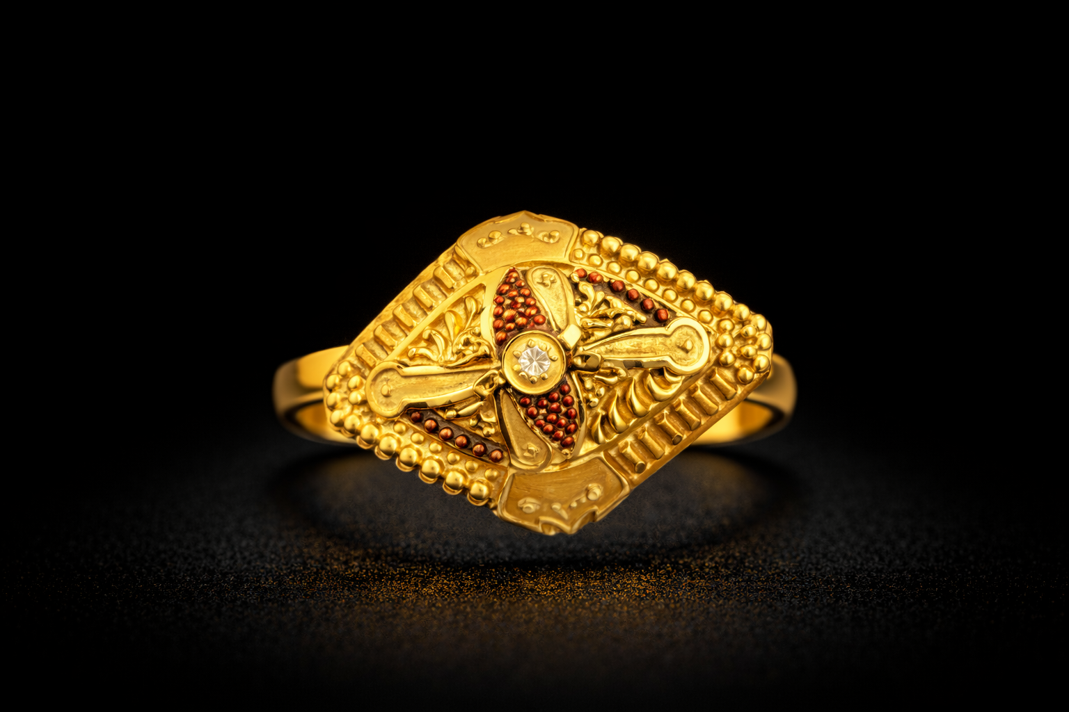 Traditional Diamond-Shape Gold Ring with Center Stone and Red Bead Detailing