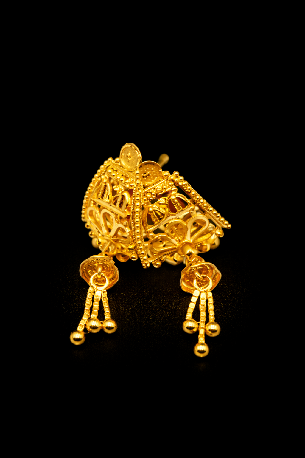 The dome part has elegant cutwork patterns and small decorative designs that give the earrings a rich and classic look. Fine beaded edges add extra detail and enhance the traditional appearance.