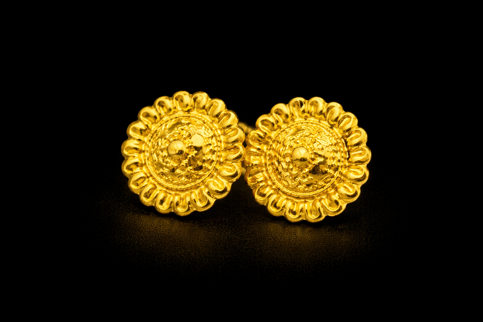 These elegant gold plated stud earrings feature a classic sunflower inspired design that gives them a bright and traditional appearance. The outer edge is designed with rounded petal shapes arranged evenly around the center, creating a beautiful floral pattern.