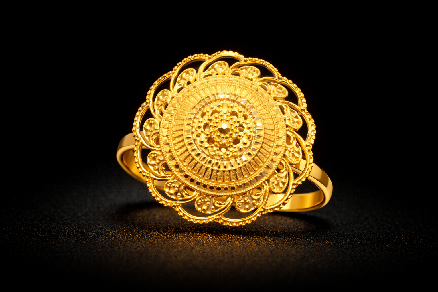 This beautifully designed gold ring features a large circular centerpiece with intricate layered detailing inspired by traditional jewelry patterns. The design combines textured surfaces, delicate cutwork, and ornamental borders to create a striking statement piece.