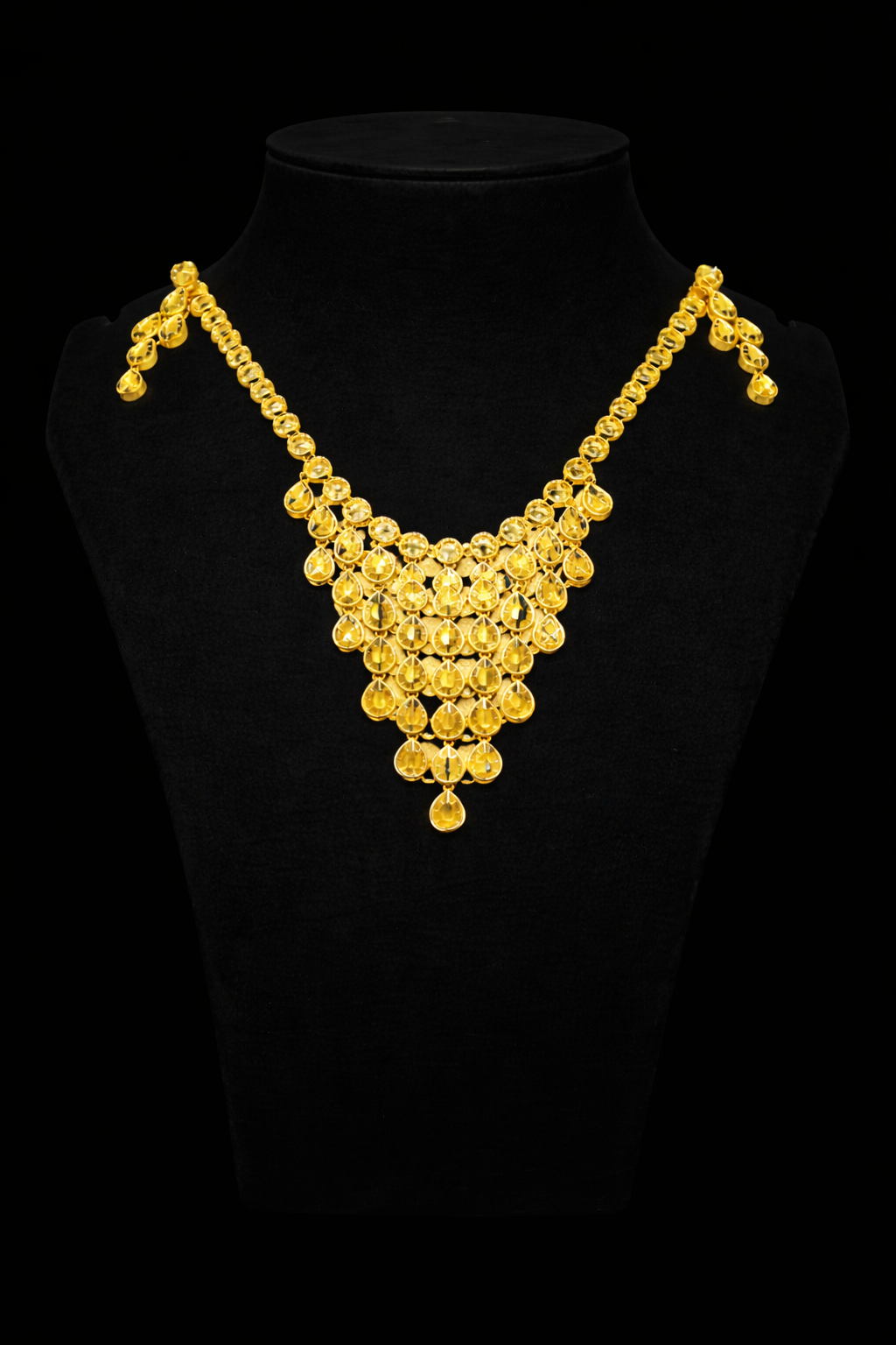 The chain part is made with round gold links connected in a smooth pattern. Near the shoulder area, there are small drop shaped hanging elements which add extra beauty.