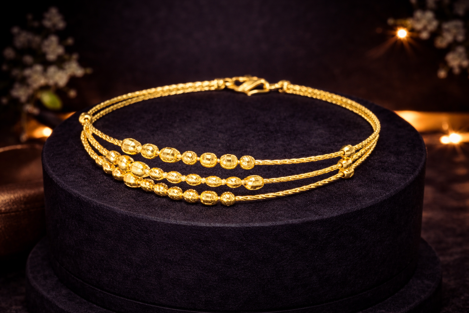 The structure consists of three slim twisted gold strands placed parallel to each other. The center portion is decorated with textured round beads arranged neatly in sequence. Each bead has fine cut detailing that enhances shine and reflects light naturally.